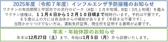 - 新型コロナ2価ワクチンを優先することから、インフルエンザワクチンの接種は例年より2週間遅れの11月上旬から開始します。医療安全を考慮しての対応です。今しばらくお待ちください。