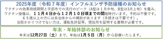 - 新型コロナ2価ワクチンを優先することから、インフルエンザワクチンの接種は例年より2週間遅れの11月上旬から開始します。医療安全を考慮しての対応です。今しばらくお待ちください。